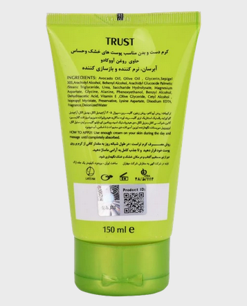 آووكادو سرشار از اسيدهای چرب سالم، ويتامينها و آنتياكسيدانهايی هست كه میتوانند پوست را بهبود ببخشند. از بهترين ترکیبات مؤثر اين ميوه برای پوست میتوان به كارتنوئيدها (مانندآلفا كاروتن، بتا كاروتن، بتا كريپتوكسانتين، زيكسانتين و لوتئين)، ويتامين C، ويتامين E و اسيد اولئيک اشاره کرد.اين تركيبات محافظ خوبی برای پوست شما هستند و از آسيبهای محيطی كه منجر به ايجاد چين و چروک و خطوط ريز پوستی میشود و ديگر عوامل که نشانگر پيری زودرس هستند، پيشگيری میكنند.کرم آووکادوی تراست، با دارا بودن روغنهای کاملا طبیعی و خالص آووکادو موجب افزایش نرمی و لطافت و یکپارچگی عملکرد پوست میشود. اثر نرمکنندگی محصول به گونهایست که پس از جذب، چربی از خود به جا نخواهد گذاشت. غنی بودن این محصول از ویتامین E علاوه بر مهار رادیکالهای آزاد و جلوگیری از آسیبهای پوستی، موجب بازسازی پوست خواهد شد. همچنین این محصول با کنترل التهابات پوستی، انتخابی مناسب برای پوستهای حساس است.